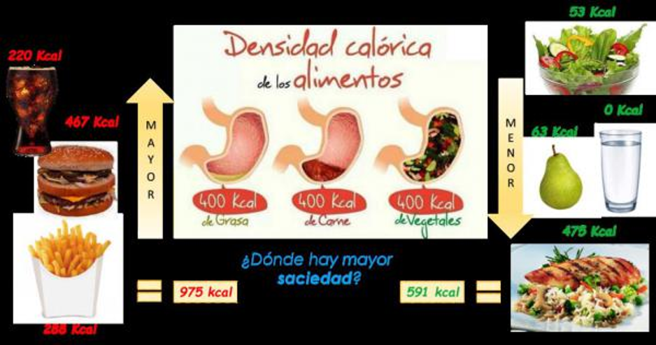 Según este concepto dos alimentos pueden tener la misma cantidad de kcal pero si son usados con frecuencia los de mayor densidad calórica tienden a producir sobrepeso. La media de un estudio al ingerir alimentos de alta densidad calórica fue de un consumo de 143kcal más por comida.