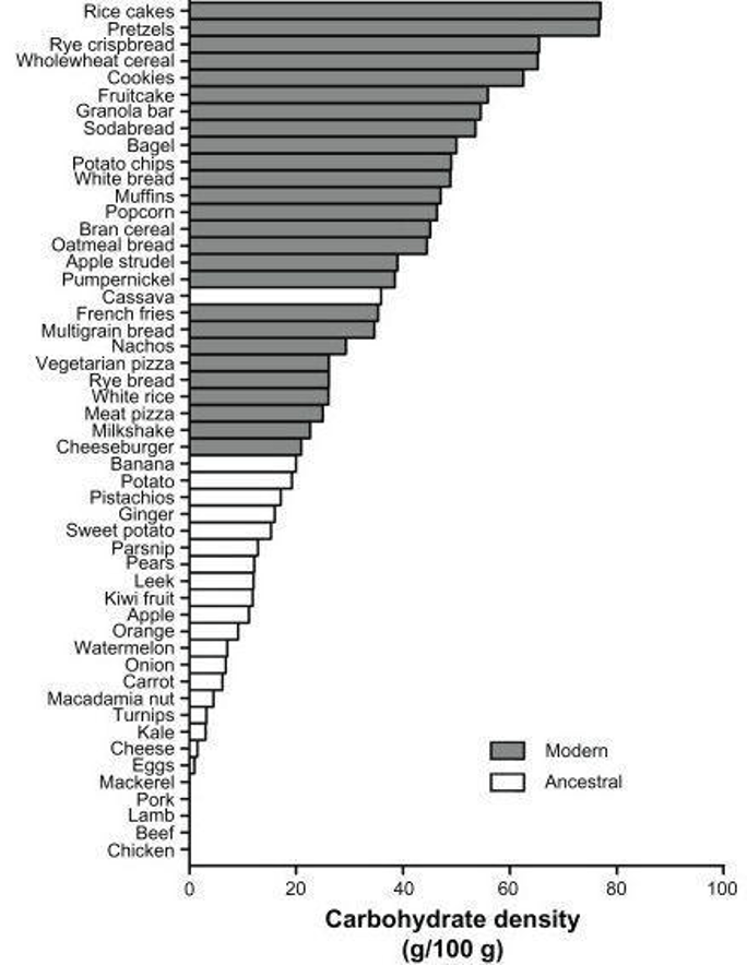 Merece la pena centrarse en los Hidratos de Carbono, ya que últimamente parecen los grandes enemigos a la hora de perder peso. Sin embargo en una revisión se analizaron las diferencias en cuanto a densidad de los carbohidratos “modernos” y los ancestrales. Curiosamente los modernos tienen una alta densidad, mientras los naturales sin procesar contienen gran cantidad de fibra y eso reduce enormemente su densidad. Es decir, es mucho mejor comer patata cocida para reponer nuestros depósitos de glucógeno tras un entrenamiento que un plato de pasta aunque tenga la etiqueta de “integral” bien grande.