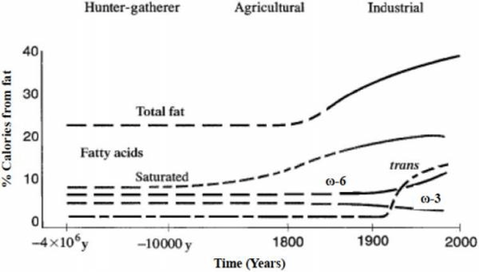 Se piensa que nuestros antepasados tenían una dieta muy equilibrada con un ratio 2:1 (el doble de Omega 6 que de omega 3) y las recomendaciones son de no exceder el ratio 10:1. Sin embargo el problema es que en la sociedad actual estamos superando con creces y según una interesante investigación se considera que el ratio actual es mayor de 20:1. Siendo el gran incremento de Omega 6 junto a las grasas trans uno de los grandes responsables de los problemas de obesidad y salud metabólica.