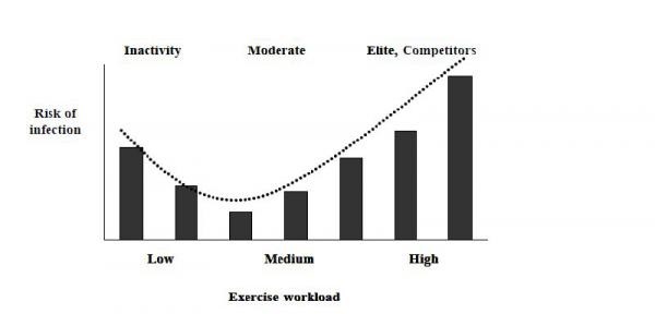 – El ejercicio físico intenso y de larga duración produce inmunodepresión después de su realización y aumenta las posibilidades de infección (estudio), muchas de las células inmunes migran hacia el musculo dañado (estudio) dejando debilidades en otras zonas (es decir, es más perjudicial un entrenamiento de carrera que de bicicleta por el mayor daño muscular)