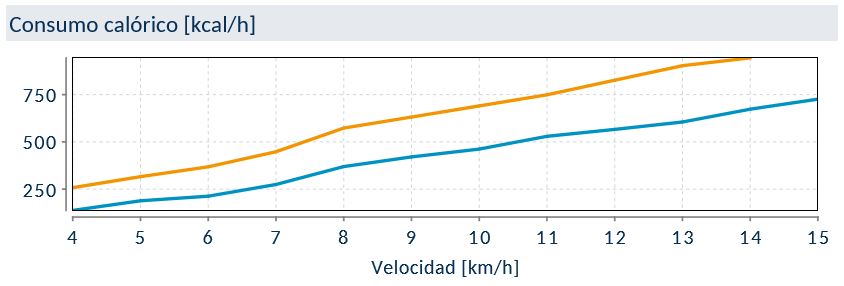 En el siguiente ejemplo se pueden ver a dos sujetos corriendo a la misma velocidad y muy diferentes consumos de kcal/h. Uno de ellos es un triatleta de buen nivel (color azul) con una economía de 190 ml/kg/min y el otro un corredor popular (color naranja) con economía mejorable, ya que sus valores eran superiores 210ml/kg/min