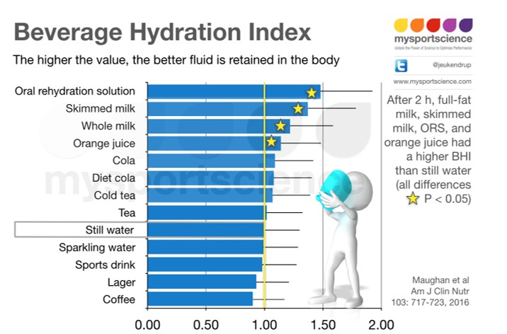 En este caso a pesar de su contenido energético de 350kcal/L la leche desnatada en la valoración realizada a las 2h obtuvo incluso mejores resultados que el suero oral.