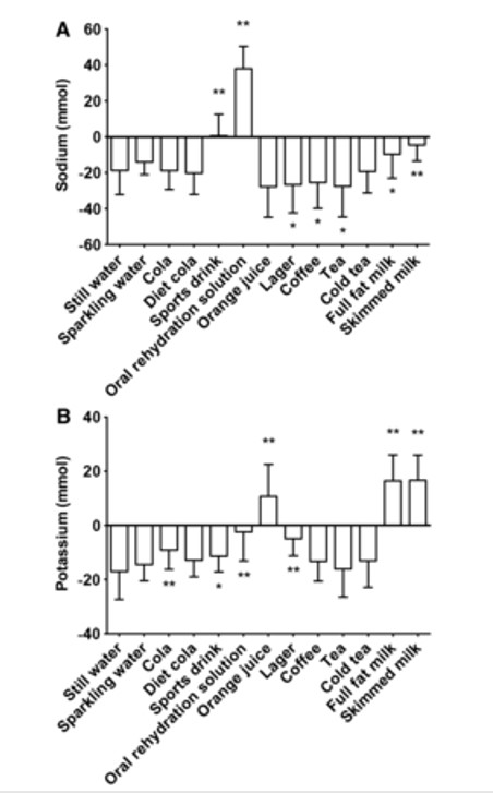 Al parecer la cantidad y balance de sodio y potasio que tienen las bebidas es la principal cualidad para que una bebida sea rehidratante, minerales muy importantes para la salud como ya vimos en otra entrada. Como vemos en este gráfico el potasio de la leche y el zumo parece que tiene mucha importancia en esta capacidad de rehidratación