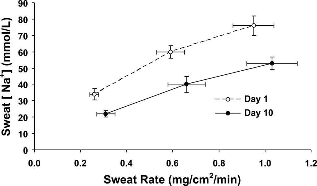 En algunos estudios se ha podido comprobar como el entrenamiento en calor permite una mejor adaptación con menos cantidad de líquido y sobre todo mayor reabsorción de Sodio, disminuyendo la concentración en el sudor tras varios días de entrenamiento (estudio).