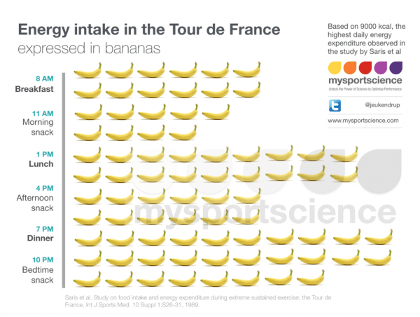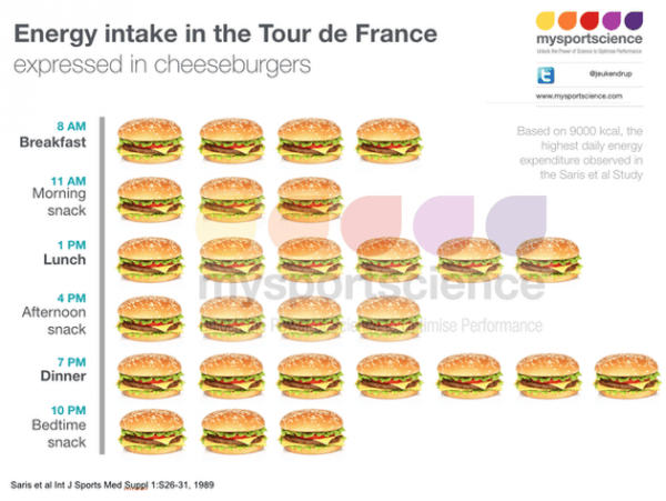 Para entenderlo mejor vamos a utilizar el ejemplo de una etapa exigente del tour de Francia con un consumo de unas 9.000 kcal. En una de estas etapas los ciclistas pueden pasar encima de la bicicleta mas de 6h. Según este estudio durante este tiempo la media de ingesta es de «solo» unas 250-300 kcal/h por lo que se podrán ingerir menos de 2.000 kcal. Cada vez hay más tendencia a tratar de ingerir la máxima cantidad posible de HC durante la prueba, incluso una reciente investigación ha mostrado la posibilidad de ingerir mas de 120gr/h de hidratos de carbono durante una competición (estudio)