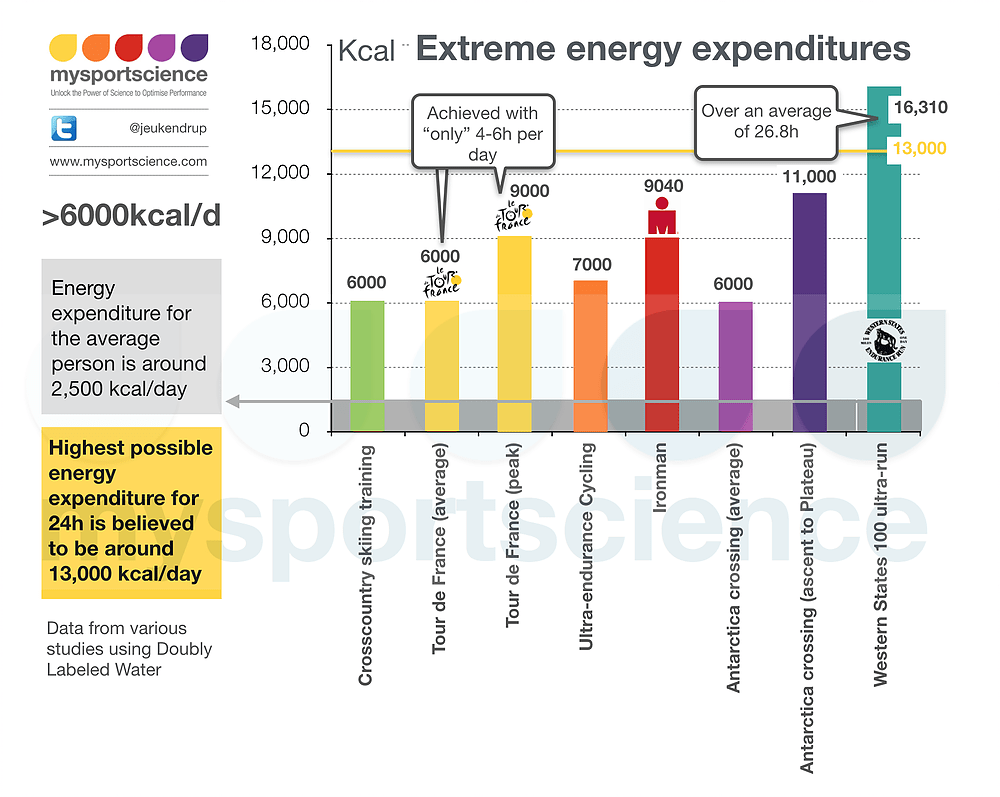 Si hablamos de kcal podemos fijarnos en este cuadro resumen de MYSPORTSCIENCE en la que vemos como algo muy habitual en deportistas consumir 6.000kcal, incluso en días de entrenamiento habituales. En pruebas de un solo día como en Ironman se pueden superar las 9.000 kcal, e incluso en pruebas de carrera de ultrafondo de 24h ininterrumpidas hasta 13.000 kcal