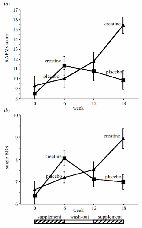 En este estudio por ejemplo, se pueden ver los efectos de incluir dosis de 5gr día de creatina o placebo durante 6 semanas sobre un test de inteligencia y otro de memoria. Y a continuación a la inversa (cambio de grupos) tras un periodo de “lavado” de 6 semanas