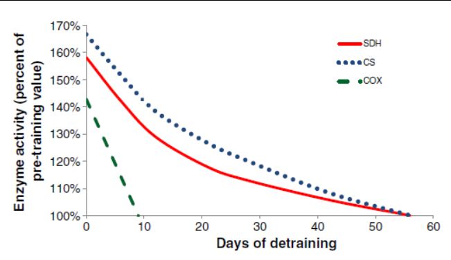 La misma investigación que vimos antes de 1984 mostraba grandes cambios en enzimas mitocondriales de gran importancia como la Citrato sintasa disminuyendo un 23% en solo 21 días y un 40% a los 56 días o la Succinato deshidrogenasa con pérdidas muy similares. Se estima que disminuyen aprox un 1-2,5% cada día en las primeras semanas de desentrenamiento (estudio)