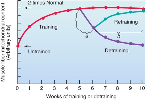 Según una interesante investigación realizada sobre sujetos bien entrenados se comprobó la densidad mitocondrial muscular al inicio y tras cinco semanas de entrenamiento con amplias mejoras. Sin embargo, se comprobó que en una sola semana de inactividad se perdía hasta el 50% del aumento mitocondrial conseguido, y se necesitaban otras 4 semanas de entrenamiento para volver a los máximos valores conseguidos previamente (estudio)