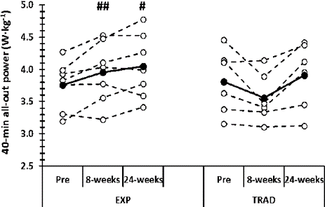 Los resultados mostraban que esa simple sesión de alta intensidad no simplemente servía para mantener la forma, sino que incluso en algunos ciclistas permitía mejorarla (grupo EXP), mientras que el grupo de baja intensidad (grupo TRAD) disminuía drásticamente el rendimiento.