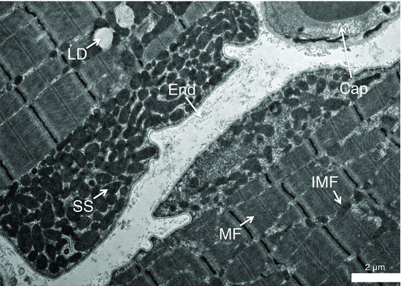 Aproximadamente un 4-7% del volumen total del músculo esquelético son mitocondrias (densidad mitocondrial). Casi un 80% del contenido mitocondrial se encuentra dentro de los sarcómeros miofibrilares (Mito IMF) y se encargan de aportar energía para mantener las contracciones musculares. Mientras que el resto (Mito SS) se encargan de mantener las demandas bioenergéticas de los transportadores de sustratos e iones que mantienen el potencial de membrana y la homeostasis citoplasmática (estudio)
