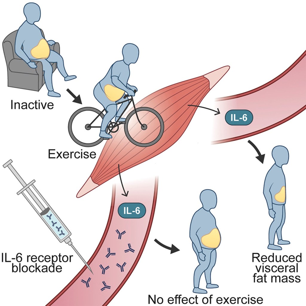 Al bloquear la acción de una sola de estas mioquinas (IL-6) mediante un medicamento, se comprobaron grandes diferencias en la pérdida de grasa abdominal entre el grupo control realizando ejercicio con disminución y el que hacía ejercicio pero utilizaba este medicamento inhibidor (estudio)