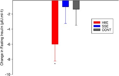 En un interesante estudio se hacia una comparativa durante 15 semanas entre el entrenamiento HIIE con sesiones de un máximo de 20min realizando bloques 8sg sprint y 12sg de recuperación (hasta un máximo 60) y otro grupo SSE que trabajaba de forma constante al 60% del VO2max (hasta 40min). Los resultados dieron como ganador absoluto al entrenamiento de alta intensidad, tanto en perdida de grasa general, como visceral. Uno de los grandes cambios entre un tipo de entrenamiento y el de intensidad moderada fueron los niveles de insulina, consiguiendo disminuir un 31% respecto a 9%