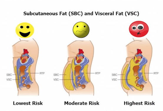 La grasa visceral es la que representa el mayor riesgo para la salud y esta muy relacionada con patologías metabólicas. A mayor desequilibrio metabólico y endocrino (resistencia a insulina y leptina), mayor predisposición a la acumulación de grasa visceral (estudio, estudio)