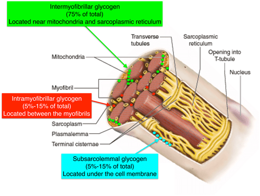 La preferencia de utilización es para el glucógeno intermiofibrilar. Sin embargo, desde el punto de la fatiga, el intramiofibrilar es el más importante. Se oxida en las fibras tipo I y II durante el ejercicio, pero está implicado en la salida de calcio del retículo sarcoplasmático y la contracción, y su depleción está muy relacionada con la aparición de fatiga (estudio). Pero todavía queda mucha investigación para poder hacer recomendaciones prácticas en este sentido.