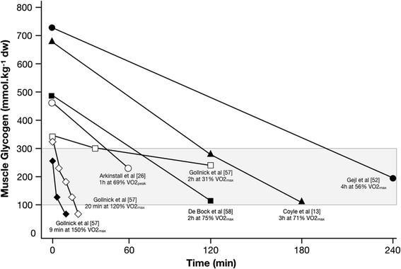 El descenso de los depósitos de glucógeno depende sobre todo de la intensidad. Aproximadamente al 70% del VO2max necesitaremos casi 3h para vaciar los depósitos, pero se ha demostrado que en un solo Test de Wingate (30sg de sprint a la máxima intensidad) se puede disminuir hasta un 32% los depósitos de glucógeno (estudio).