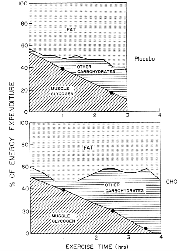 En un estudio realizado sobre ciclistas bien entrenados, al 71% del VO2max se puedo comprobar que comparando un grupo sin ingerir HC y otro con una cantidad de 1,2gr x kg de peso cada hora la utilización de combustible en la primera hora era muy similar. Sin embargo, el grupo que ingería HC era capaz de mantener la intensidad 1h más, pasando de 3h a 4h y con menores percepciones de esfuerzo. Esta hora adicional de ejercicio se realizó sin apenas utilizar el glucógeno muscular y basándose en la utilización de otros HC ingeridos durante la prueba.