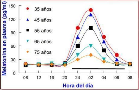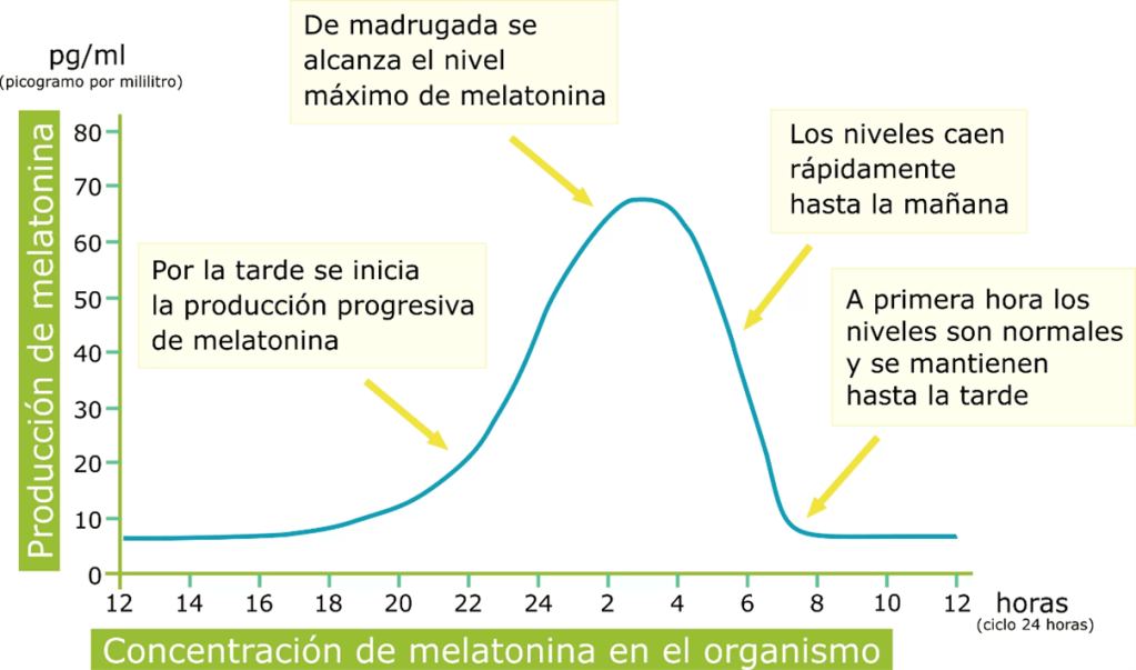 La melatonina es una hormona producida en la glándula pineal sintetizada a partir del aminoácido esencial triptófano y con múltiples funciones, pero con una altísima variabilidad registrada en las 24h del día con valores mínimos diurnos y máximos nocturnos. En individuos sanos la síntesis de melatonina se inicia al oscurecer, alcanzado el máximo entre las 12 y 2-3h de la madrugada, coincidiendo con el valor mínimo de la temperatura corporal (estudio)